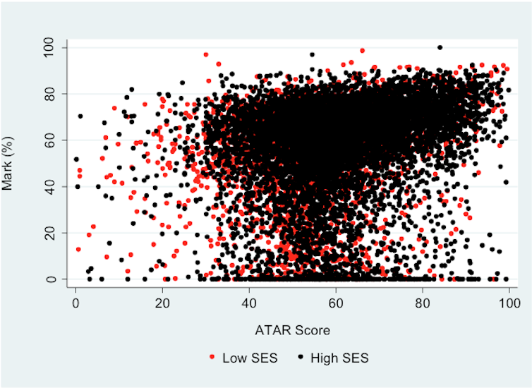However, we also find that when all observable factors are considered, high socio-economic students do better on average than low socio-economic students. This shows the extent to which factors other than ATAR scores pull down marks for low socio-economic students, suggesting that ATARs should not be the only consideration for determining student admissions.