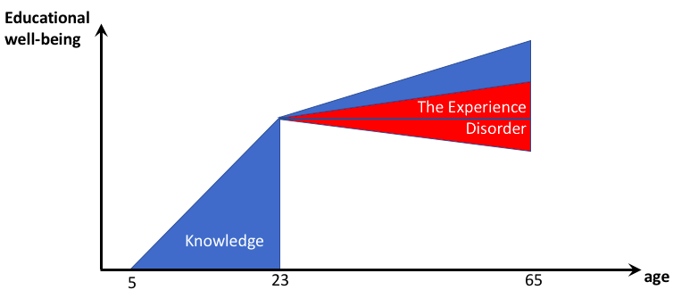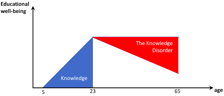 The first disorder, the knowledge disorder, shown in the chart below, captures the fact that the knowledge gained from formalised learning now decays more quickly. This happens due to faster rates of innovation and knowledge development within the periods that learning had been designed to serve.