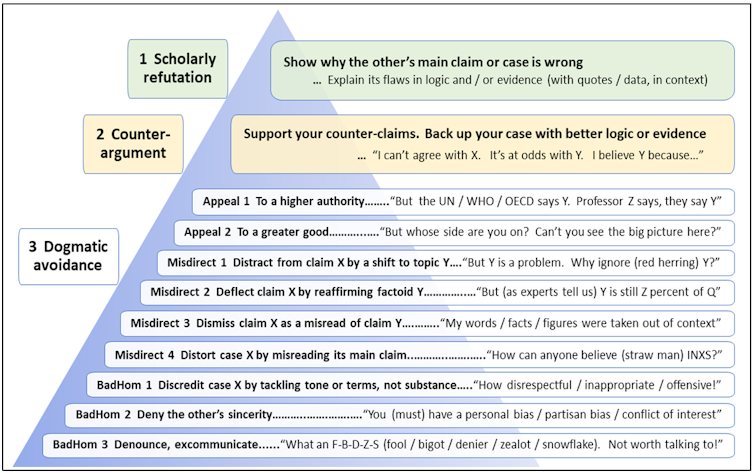 Another level 3 tactic is to take offence at the tone or terms of an opposing view, without addressing its substance (BadHom 1). This is more civil than calling someone an FBDZS — a fool, bigot, denier, zealot or snowflake (BadHom 3). But by shifting off-topic to invoke rules of civility, it offers scope to censor or end the exchange without conceding any substantive point.
